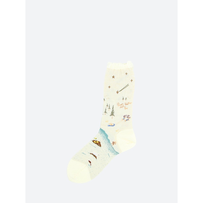 Antipast crew length socks knitted in a fine gauge blend with reindeer and winter-inspired elements.Crew lengthRuffled cuffsJacquard illustrations of reindeer, trees and outdoor elementsTonal heel and toeMaterialsFabric Content: 70% wool, 30% nylonMade in