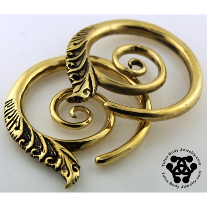 These large temple spirals are cast from solid yellow brass by Oracle Body Jewelry. They fit stretched ear lobes sized 0 gauge or larger.Dimensions: 63mm high X 63mm wideWeight: approximately 65 grams each piece