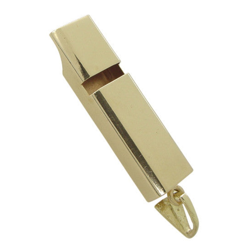 This vintage estate pendant is a full size square whistle that actually works! Circa 1960’s, this large whistle charm is a sure-fire attention getter crafted in 14K yellow gold and measuring 1 7/16 inch long by 7/16 inch wide.