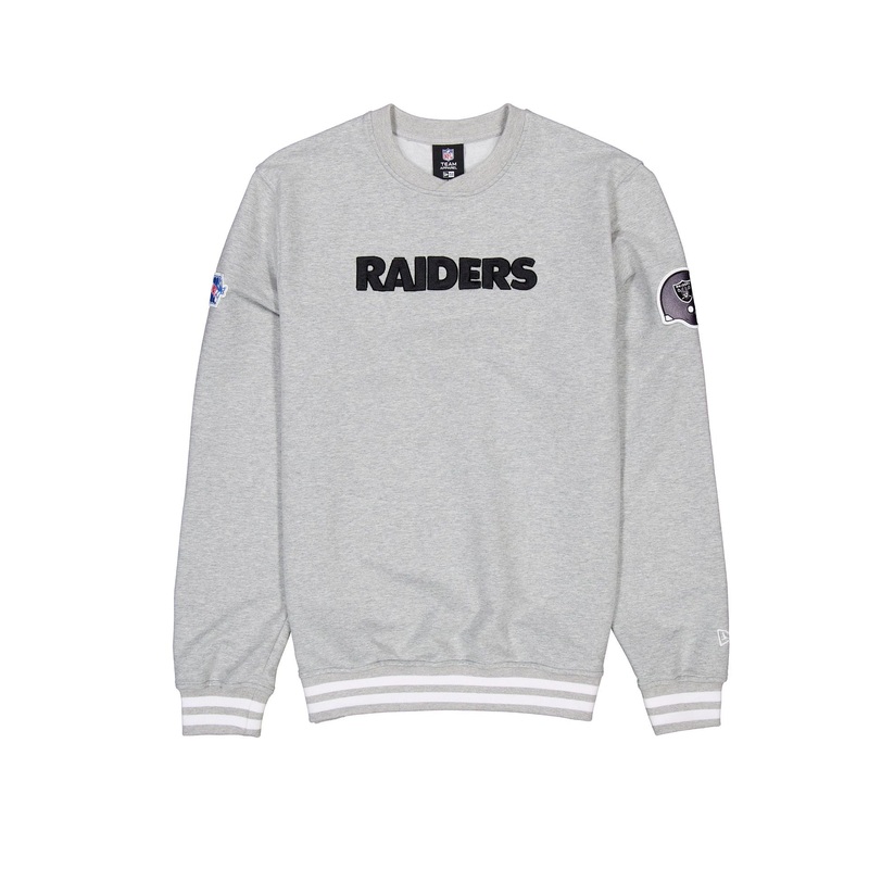 The Las Vegas Raiders Gray Logo Select Crewneck features an embroidered Raiders wordmark at the front panels with a matching team logo patch at the left arm.
