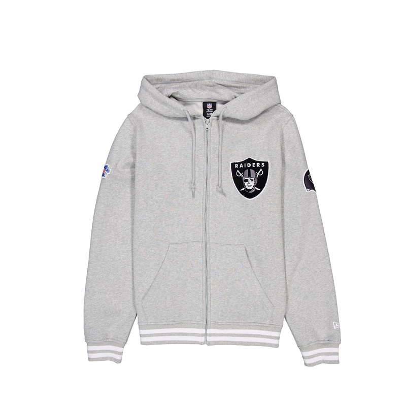 The Las Vegas Raiders Gray Logo Select Full-Zip Hoodie features a chenille applique Raiders logo at the left chest with an alternate team logo patch embroidered at the left arm and a Super Bowl XVIII patch at the right arm.