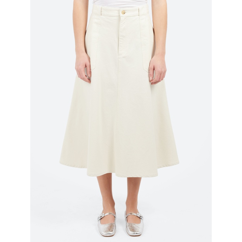 The A.P.C. long workwear-style skirt is crafted from heavyweight canvas, offering both durability and a timeless look. It features a straight cut that flares slightly at the bottom, creating a flattering silhouette that falls to mid-calf length. The mid-rise design adds structure, while large topstitched pockets that extend up to the belt loops provide a functional, stylish detail.