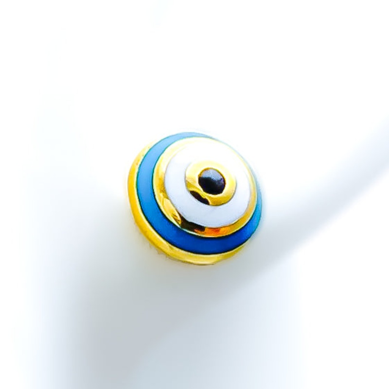 Stylish and protective, these 21k gold evil eye earrings are designed for everyday elegance with a meaningful touch. Weighing 2.4 grams, their radiant yellow gold finish enhances the intricate detailing, making them a sophisticated yet symbolic accessory. With a 0.4-inch diameter, these delicately crafted tops offer a refined yet eye-catching presence, perfect for daily wear or special occasions. Secured with a convenient push-back post, they provide a comfortable and secure fit. Ideal for those who appreciate luxurious yet meaningful jewelry, these earrings bring a blend of charm, luck, and elegance to any collection.