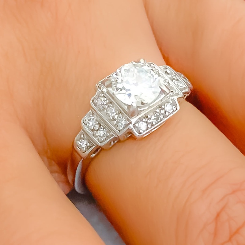 This platinum 950 ring exudes luxury with its lavish tiered design, featuring 0.80ct of round brilliant cut diamonds. Weighing 4.7 grams, the ring is finished in white rhodium, enhancing the brilliance of the F-G color and VS quality diamonds. Available in a size 6.5 with sizing options, this ring combines the enduring strength of platinum with the sparkle of high-quality diamonds. The tiered arrangement adds depth and sophistication, making it a perfect choice for those who appreciate elegance and opulence in their jewelry.