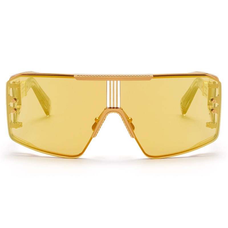 The Balmain Eyewear // Le Masque gives a decidedly modern twist to the power of a perfectly crafted, mysterious shield. Le Masques Japanese Titanium frames sport enamel embellishments, as they smoothly curve to follow the contours of the face. The impressive nylon lenses and striking side shields adopt the latest Balmain Runway color combinations, as well as new spins on the historic Labyrinth motif, which premiered over fifty years ago in Monsieur Balmains couture collections. One particularly eye-catching Le Masque option a shimmering Gold-Flash Mirror design makes the lines connection to the French Renaissance court as clear as possible, with its extraordinary Roi Soleil brilliant shine. Act quickly. That special gilded frame is an extremely limited-edition design and is restricted to only 500 numbered frames. Handmade in Japan. Includes Balmain box, hard case, soft case, cleaning cloth, and 1-year manufacturer warranty.
