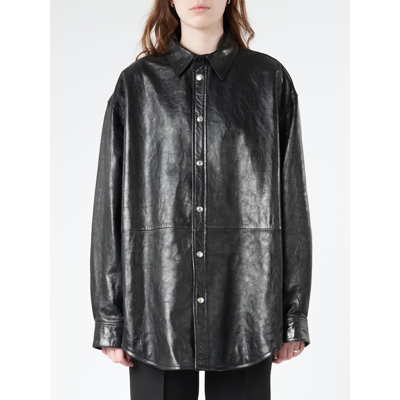 Shirt jacket is cut to a relaxed fit and below hip length. Crafted from leather with a shiny finish.Point collarSnap button closureEmbossed logoSide pocketsRelaxed fitMaterialsFabric Content: 100% lamb leatherLining: 100% viscoseSize GuideRuslana wears siz