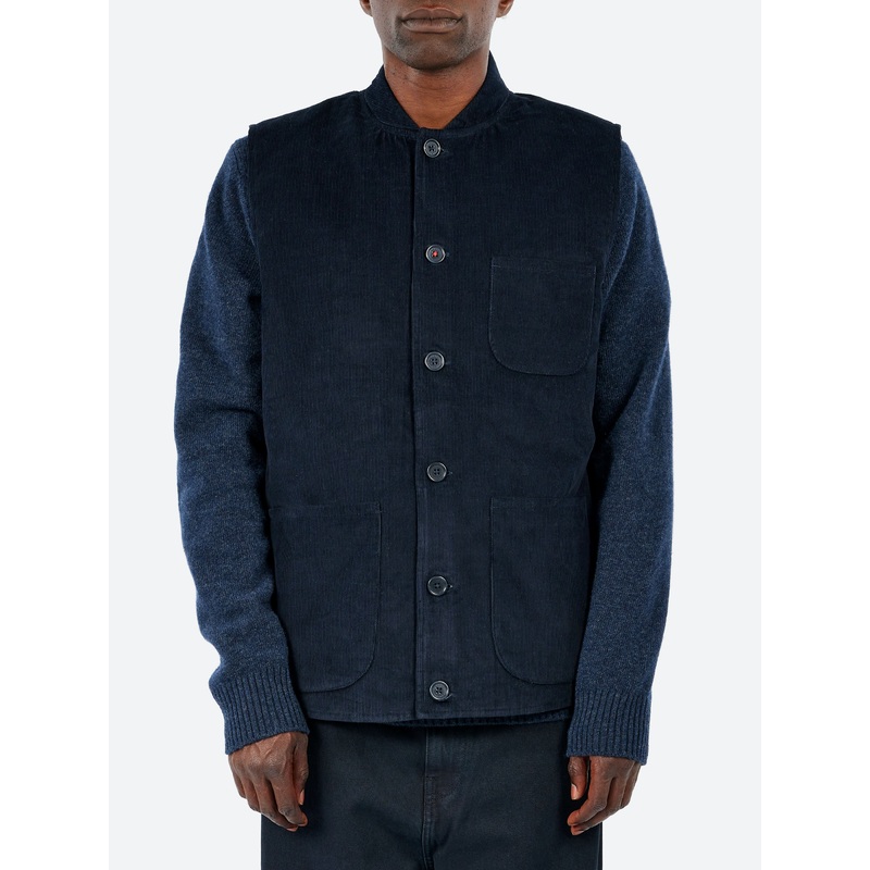 The Leo is a lightly quilted vest detailed with a hand-embroidered patch. Designed in a regular fit, it sits close without restriction. The quilting lends texture to the surface, giving the vest a subtle depth.Quilted vest14 wales corduroyResponsibly dyedR