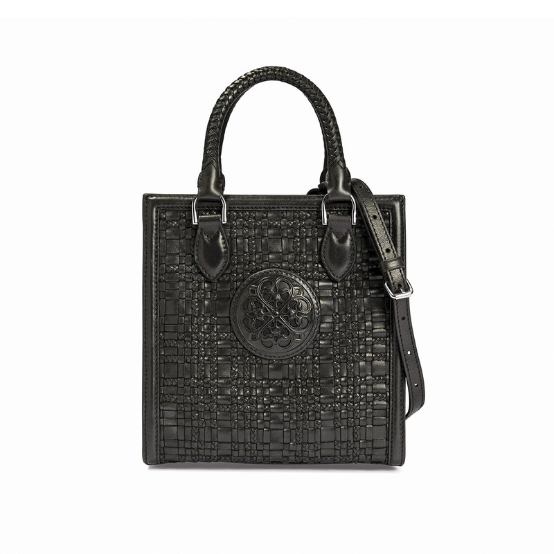 Luxurious, sophisticated and filled with impeccable details, this Ferrara bag is finely braided and woven into a work of art. Strips of incredibly luminous leather are handcrafted and a 3 dimensional medallion is hand-set into the woven panel.
