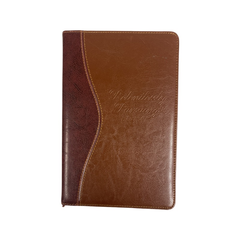 This leather journal says “Relentlessly Pursuing Jeremiah 29:13” on the cover.