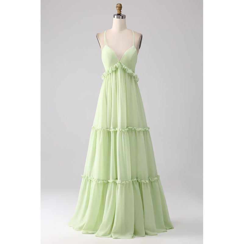 Light green A-line thin shoulder strap backless lotus leaf side length bridesmaid dress
