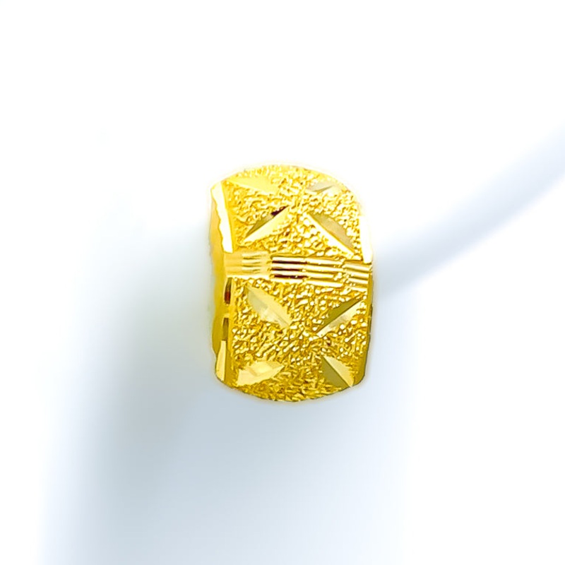 These 22k gold earrings, weighing 2.4 grams, feature a light-weight and intricately engraved design that exudes elegance and sophistication. The yellow gold finish enhances their luxurious and radiant appearance. Measuring 0.5 inches in length, these tops-style earrings are perfect for adding a touch of refined beauty to any outfit. They are secured with push back posts, ensuring a comfortable and secure fit. Ideal for those who appreciate detailed craftsmanship and subtle elegance, these stunning earrings are a standout addition to any jewelry collection.