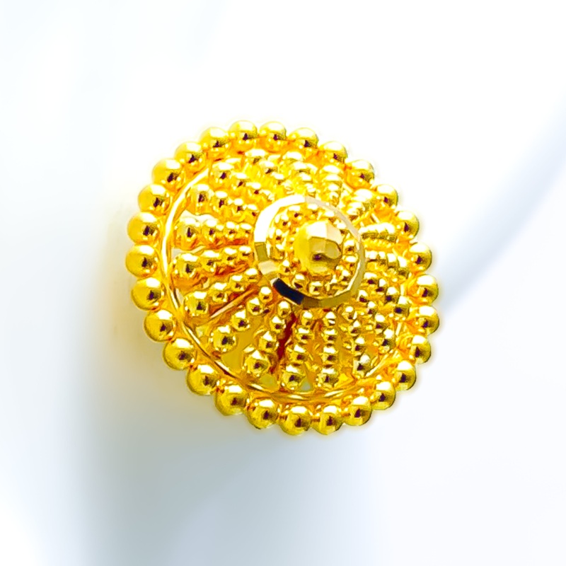 Delicately designed, these 22k gold earrings offer a perfect blend of elegance and comfort with their lightweight craftsmanship. Weighing just 5.0 grams, their radiant yellow gold finish enhances their refined beauty, creating a subtle yet eye-catching glisten. With a 0.6-inch diameter, these charming tops provide a graceful presence, ideal for everyday wear or special occasions. Secured with a sturdy screw-back post, they ensure a comfortable and secure fit. Perfect for those who appreciate effortless sophistication, these earrings add a luminous touch to any fine jewelry collection.