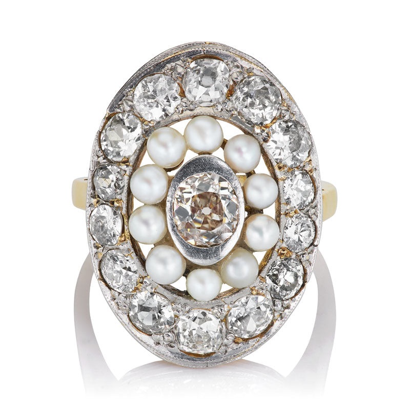 TheLilibet ring is an authentic vintage diamond and pearl cluster ring from the Edwardian Era circa 1900. The ring centers an old mine cut diamond of approximately M-N Light Brown,SI-I clarity weighing approximately 0.69-carats. A halo of 9 pearls surround the center stone with an additional 14 old mine cut diamonds forming an outer-halo. These stones grade approximately J-K color, VS-SI clarity and combine for approximately 2.00-carats. The stonesare all set in alovely two-tone platinum and 18kt yellow goldsetting. The ring is currently size7 and can be resized!