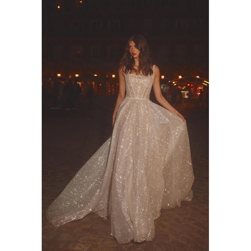 Lined square neck shiny Bohemian style wedding dress with sweeping train