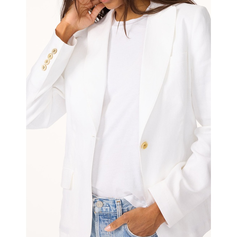 a summery take on tailoring. crafted from lightweight, textured linen, this blazer is cut for a comfortable fit that goes with everything.butterfly lining in the back body; fully lined sleevespeaked lapelsingle horn button on the waistwelt pockets with tuc