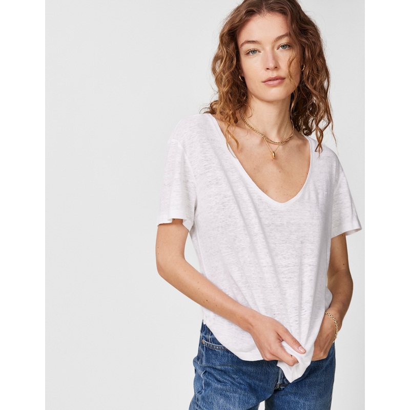an everyday essential that’s as comfortable as it looks. crafted from soft, breathable linen, we designed this tee with a wide v-neck and relaxed fit through the body. style it with everything in your closet, from silk skirts to classic jeans.