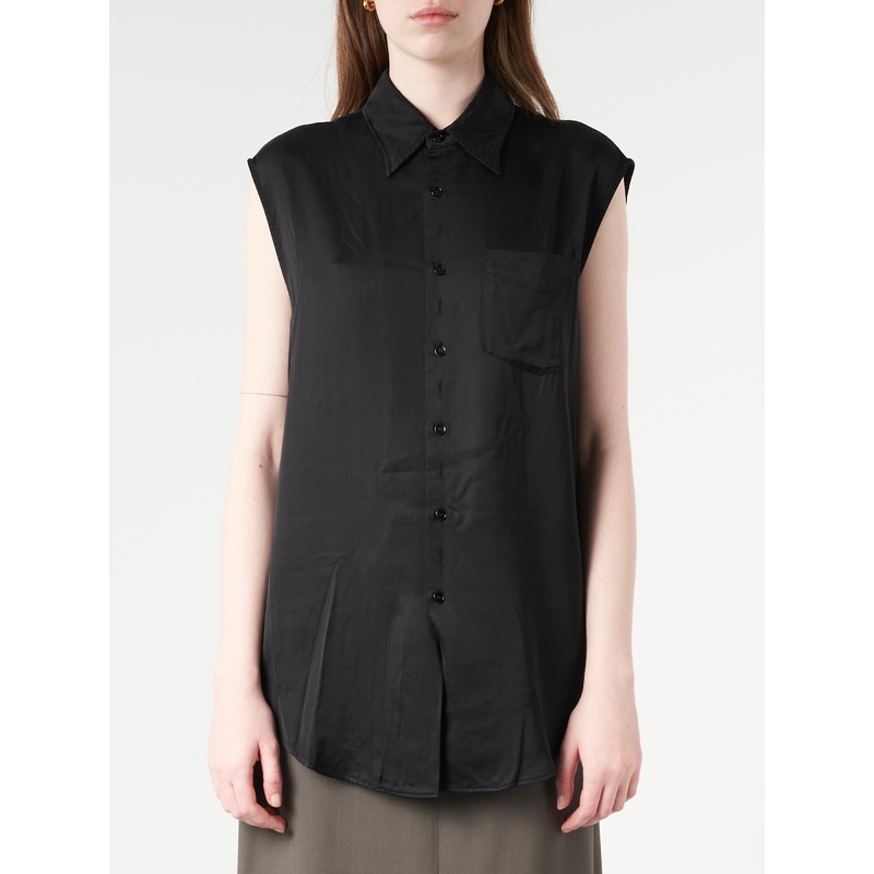 MM6s off kilter vision inspires this sleeveless shirt, cut from lining look with a sharp point collar, a patch pocket and alternating button closure. The brands discreet yet distinct signature, a horizontal line of white stitches, is found on the back.
