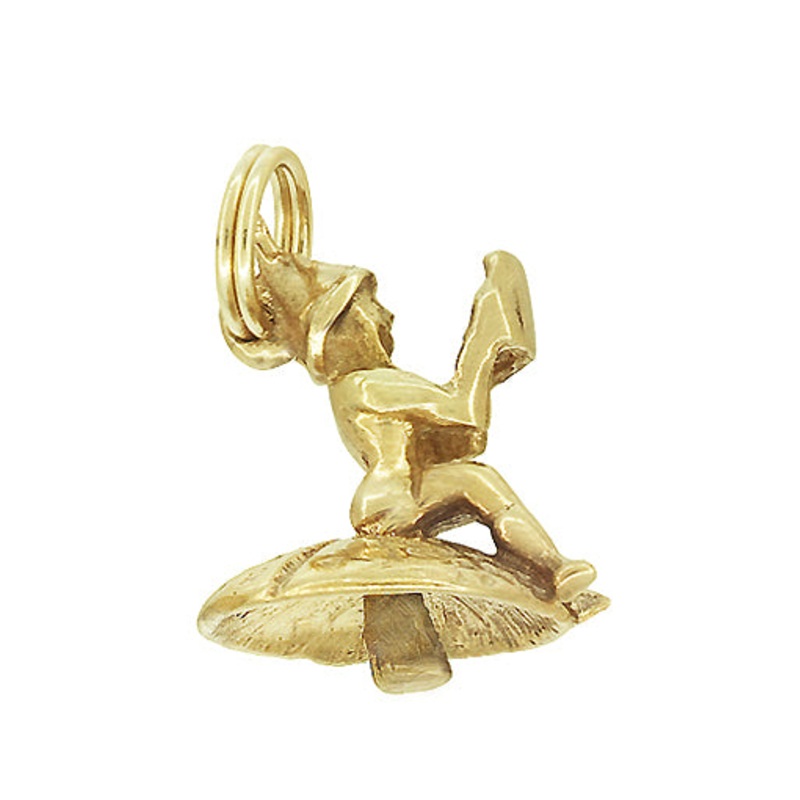 This unique vintage gnome charm in solid 14K gold is sitting on a mushroom while reading a book. Crafted in an original 1950's vintage design in your choice of 14K yellow gold or 14K white gold, this cute three dimensional gnome pendant measures 5/8 inch h