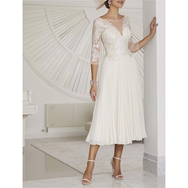 Little White Dresses Formal Wedding Dresses A-Line Boat Neck 3/4 Length Sleeve Tea Length Chiffon Bridal Gowns With Pleats Beading