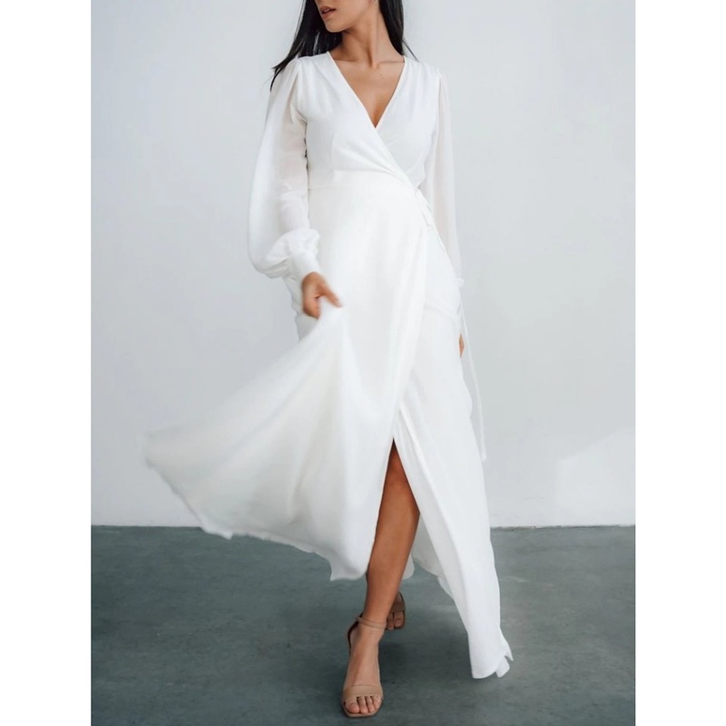 Be the first to review “Little White Dresses Wedding Dresses A-Line V Neck Long Sleeve Ankle Length Chiffon Bridal Gowns With Pleats Split Front”