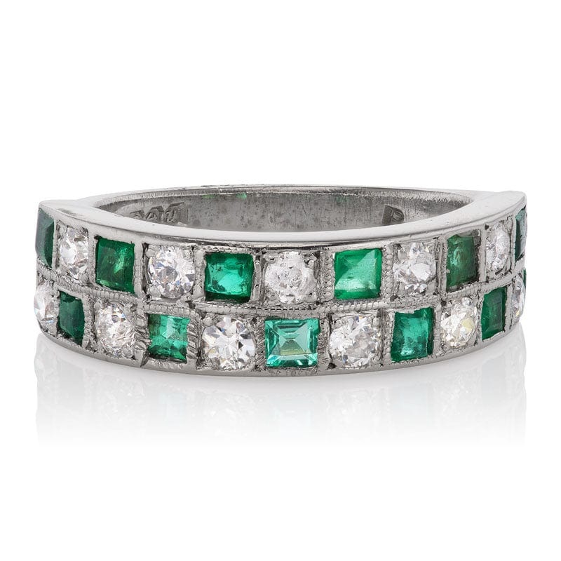 Vintage Diamond & Emerald Checkerboard BandTheLola ring is an authentic vintage diamond ring circa the 1960s. The ringfeatures alternating rounddiamonds and emeralds in a checkerboard pattern. The diamonds combine for approximately total carats and are set