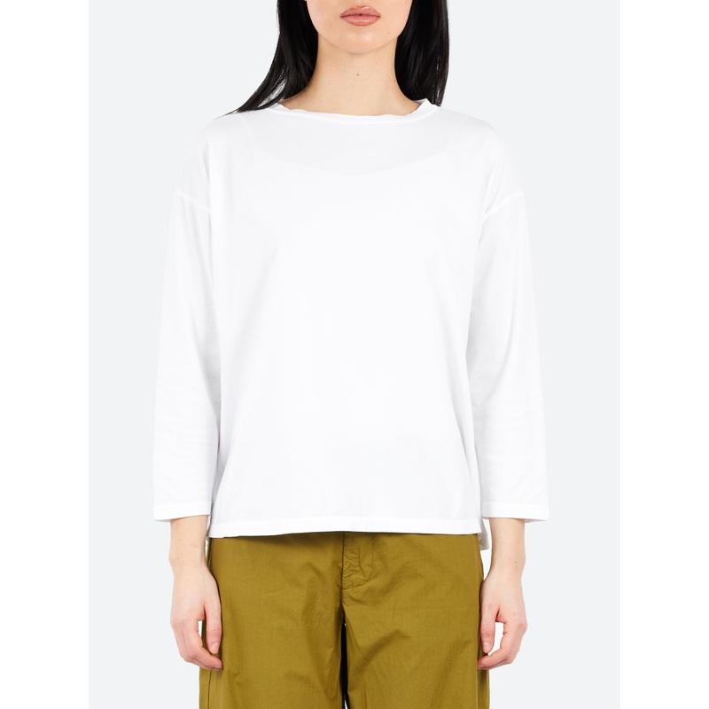 This boatneck tee features a relaxed, boxy fit and is made from a cotton crepe fabric, which is both smooth and comfortable. The three-quarter length sleeves and roll-edge finish at the neckline and hem give it a laid-back, modern vibe. It’s versatile and casual, perfect for layering or wearing on its own.