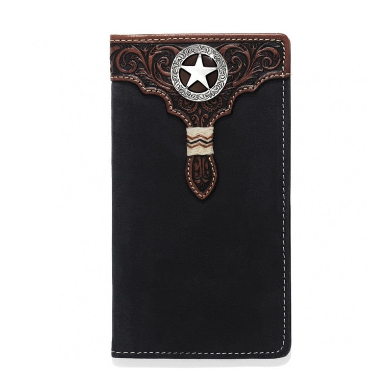 Only a true cowboy would carry this handsome checkbook wallet. Made from a dark brown leather, unique like a lone star, it is practical, durable, and built to fit cards, checkbook, a pen, id, and more.