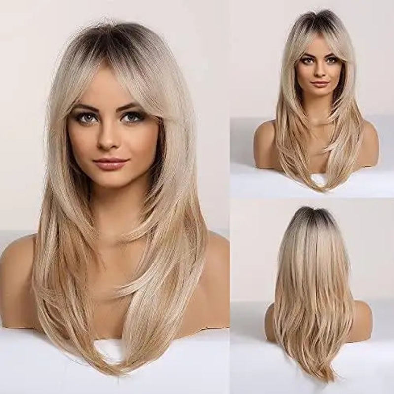 Long Blonde Layered Synthetic Hair Wig with Dark Roots