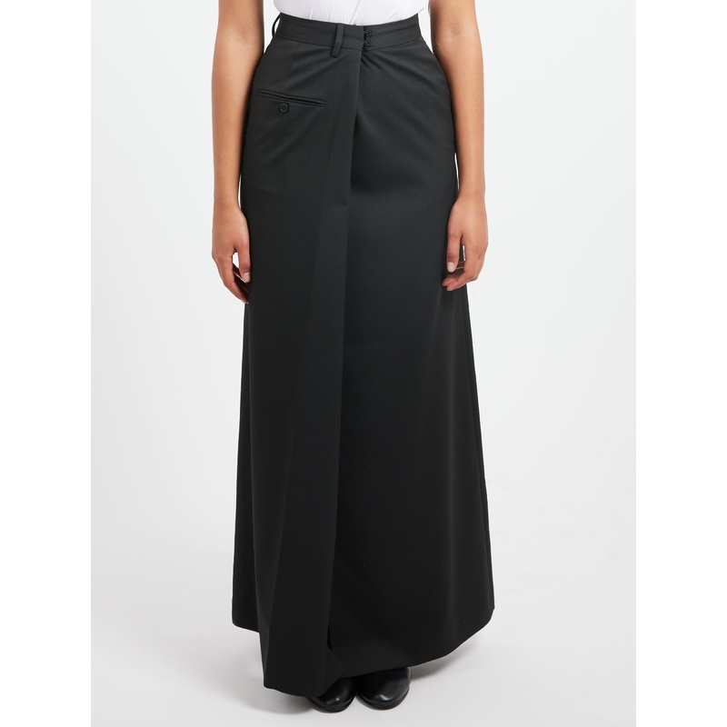 This long skirt embodies MM6's deconstructive design approach and commitment to disrupting traditional forms. The practical zip and hook closure reflect the Maison's utilitarian ethos, exquisitely finished with its distinctive white stitch line at the back