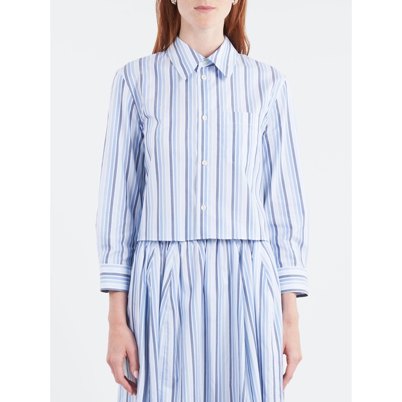 Long-sleeved shirt made from compact organic cotton poplin, flaunting a vertical striped pattern in tonal hues.Point collarFront button closureChest pocketButtoned cuffsOversizedCropped lengthMaterialsFabric Content: 100% cottonMade in ItalySize GuideBrina