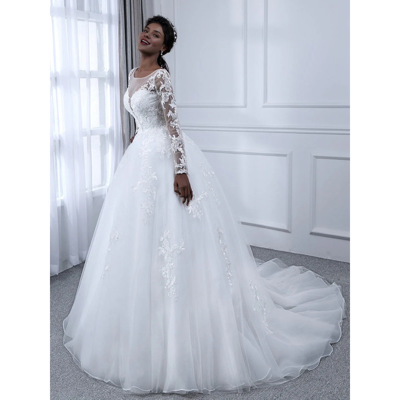 Long sleeved and applique transparent collar chiffon ball gown wedding dress