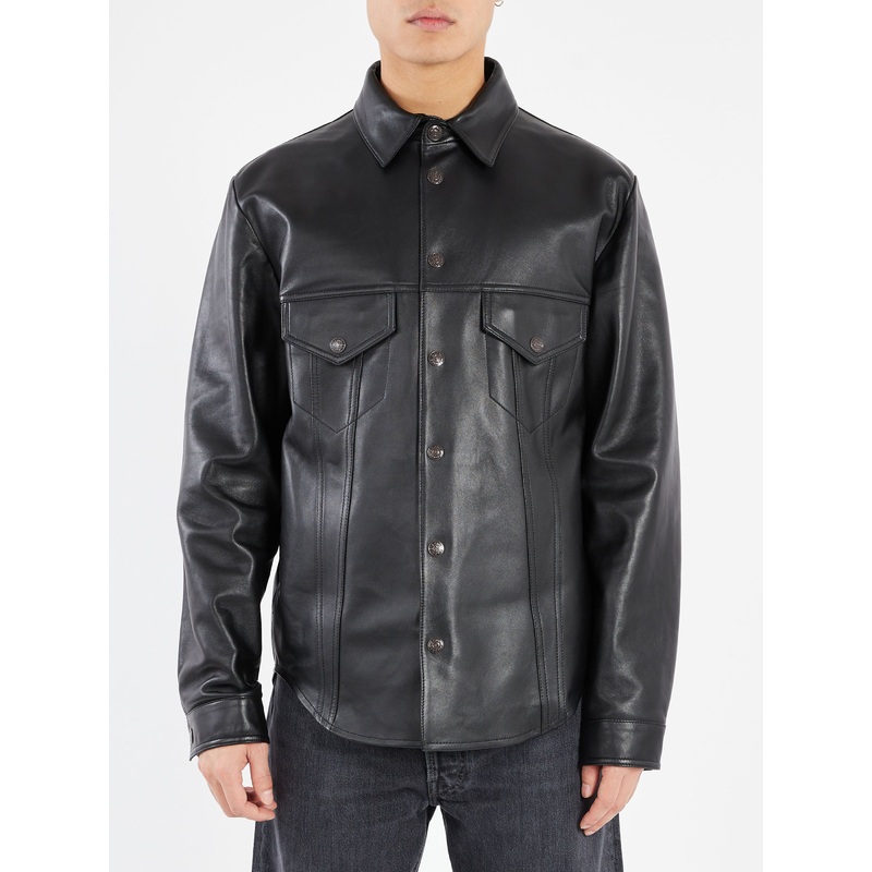Overshirt is cut to a relaxed fit and below hip length. Crafted from leather with a shiny finish.