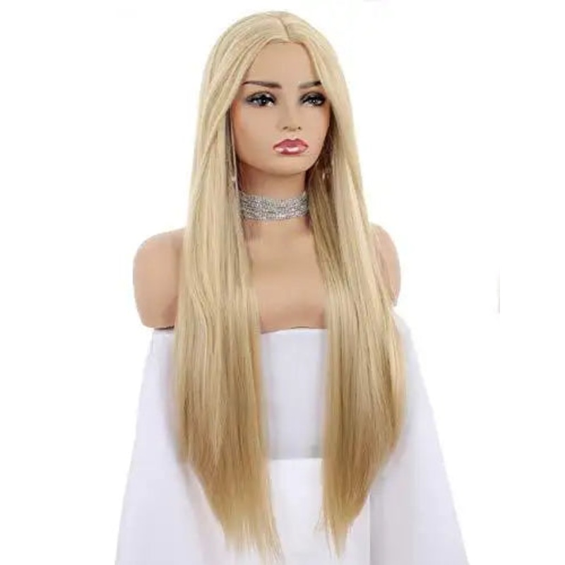 Long Straight Blonde Wig with Middle PartLength: 24-26 inchesColour 27/613Machine Made Wig,Heat Resistant up to 150 Degrees Centigrade (300 Degrees Fahrenheit)4.Wig Cap:,Round Skin Top with open wefts(Average Cap Size) with Adjustable Straps (fits most hea