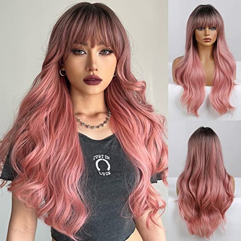 Long Wavy Ombre Pink wig with Bangs