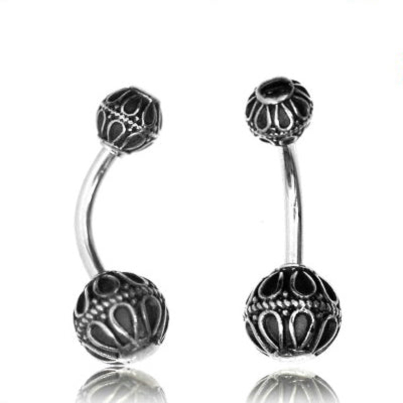 The 14 gauge looped belly ring ismade from white brass and 316L stainless steel with external threading. The 6mm top ball is removable and the 8mm bottom ball is fixed.