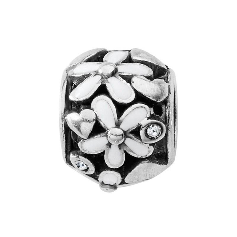 Hand-enameled flowers encircle this silver bead, dotted with hearts and hand-set fine quality crystals. A lovely way to add a floral touch to your charm bracelet or jewelry.