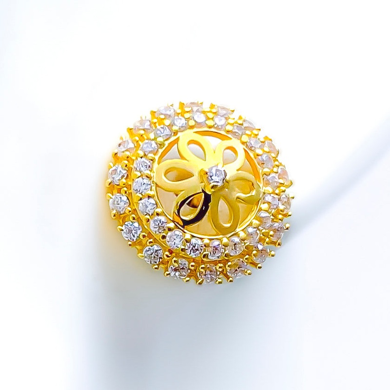 These 22k yellow gold earrings, weighing 5.7 grams, boast a lovely flower design, beautifully enhanced with cubic zirconia. The earrings are styled as tops, with a diameter of 0.6 inches, perfect for adding a subtle yet elegant touch to any look. The screw
