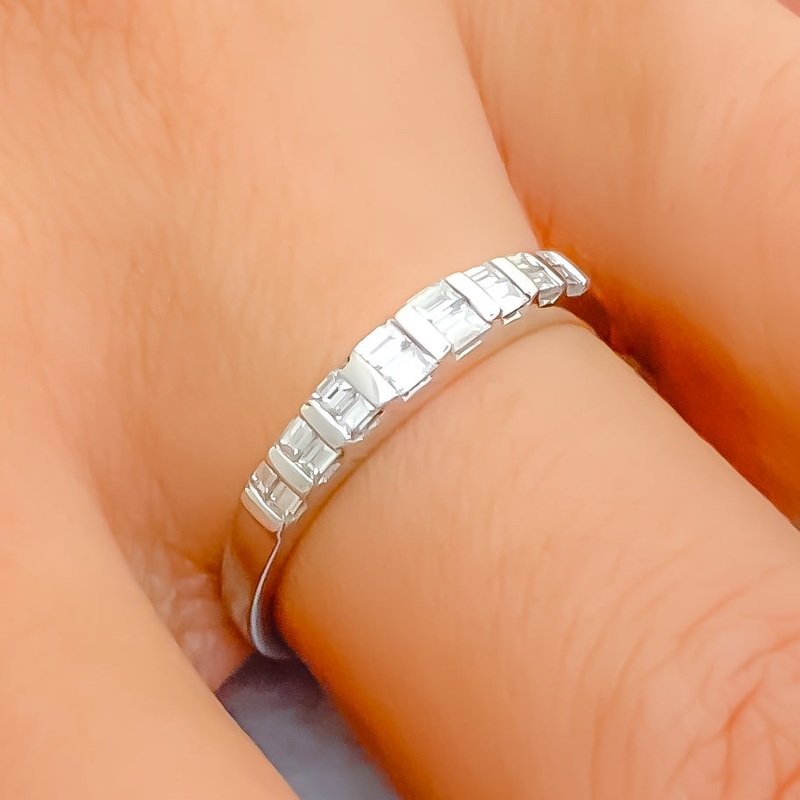 This charming 18k white gold ring, weighing 1.9 grams, showcases a lovely striped design accented by 0.27 carats of baguette-cut diamonds in F-G color and VS quality. The sleek, linear pattern of baguette diamonds adds a modern and refined touch, making it