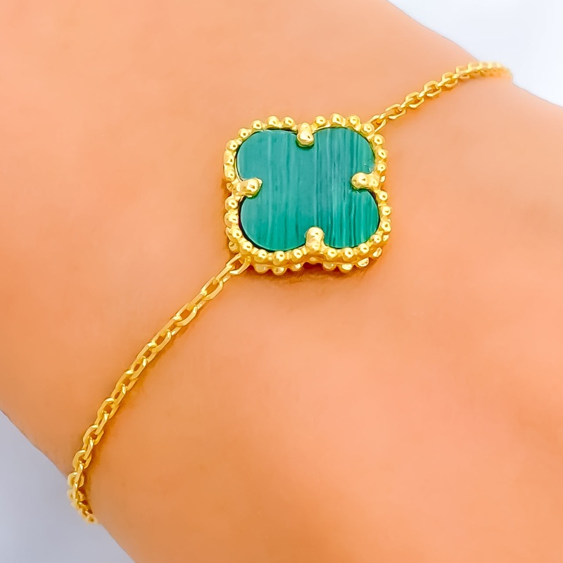This delicate 21k gold bracelet, weighing 3.0 grams, showcases a charming clover design accented with colorful ceramic for a lively and stylish touch. The polished yellow gold finish enhances its refined appeal, while the 7.75-inch length with 1-inch adjus