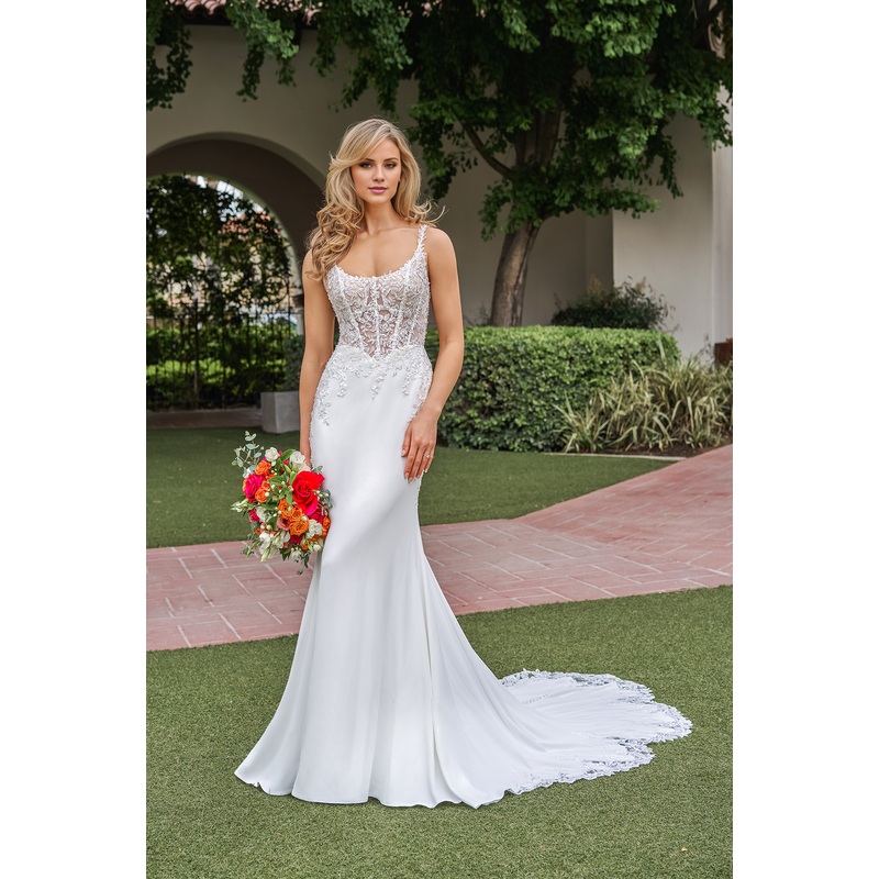Low round neck fan-shaped lace fitted horn and floor length wedding dress