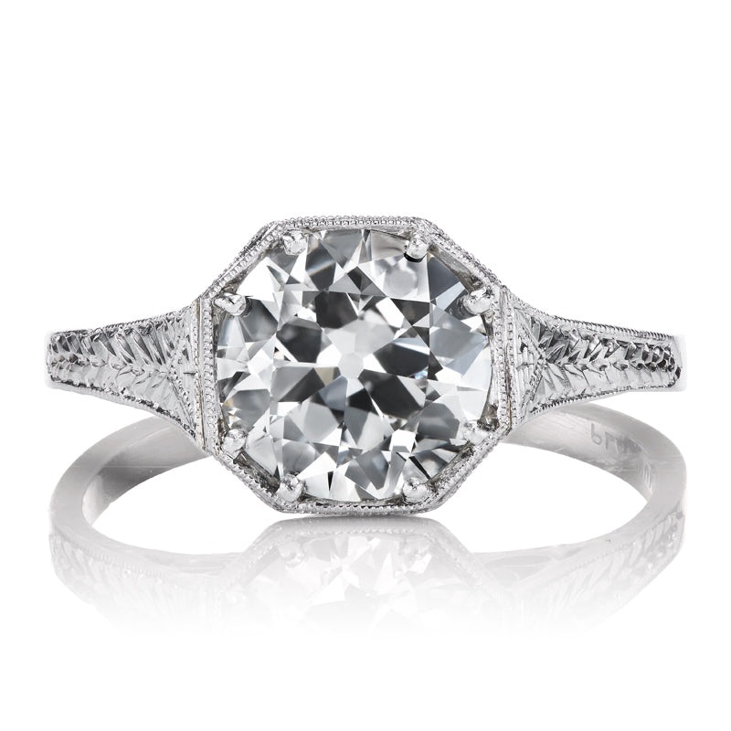 The Lucas ring is an authentic vintage diamond ring from the Edwardian Era circa 1900. The ring centers a GIA-certified 1.63 carat Transitional Cut diamond of J color, SI1 clarity. The stone is set in a Platinum octagonal setting with romantic filigree and engravings throughout the shoulders and basket. The ring is currently size 5.5 and can be resized!