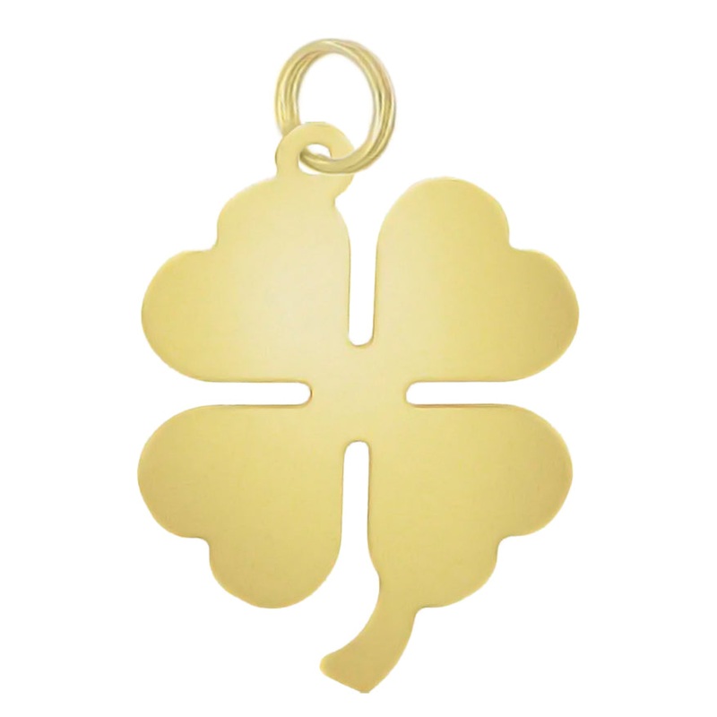 Take a little bit of luck with you wherever you go! This glorious bright lucky four leaf clover pendant in your choice of solid 14K yellow gold or 14K white gold features a high polish flat surface, perfect for engraving, and measures 7/8 inch high and 3/4