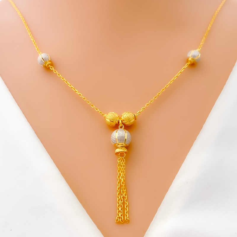 This luminous 22k gold necklace features an exquisite dangling design that combines the elegance of yellow and white gold. Weighing 9.0 grams, it offers a luxurious yet comfortable feel. The radiant blend of yellow and white gold enhances its sophisticated