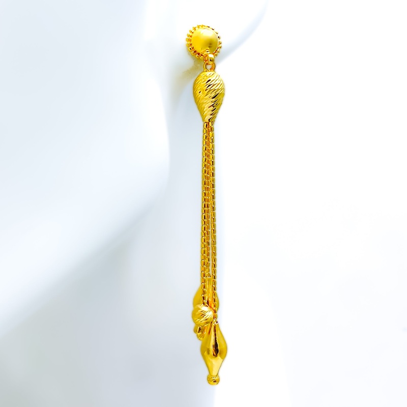 Exuding refined charm, these 21K gold hanging earrings feature a delicate yet captivating 3.3-inch length. Weighing 6.9 grams, they showcase an elegant yellow gold finish that enhances their timeless beauty. The graceful design allows for effortless movement, making them perfect for both special occasions and sophisticated daily wear. Secured with a push-back post, they provide a comfortable yet firm fit. Their intricate craftsmanship and luminous gold sheen make them a versatile addition to any jewelry collection, offering a balance of subtlety and luxury.