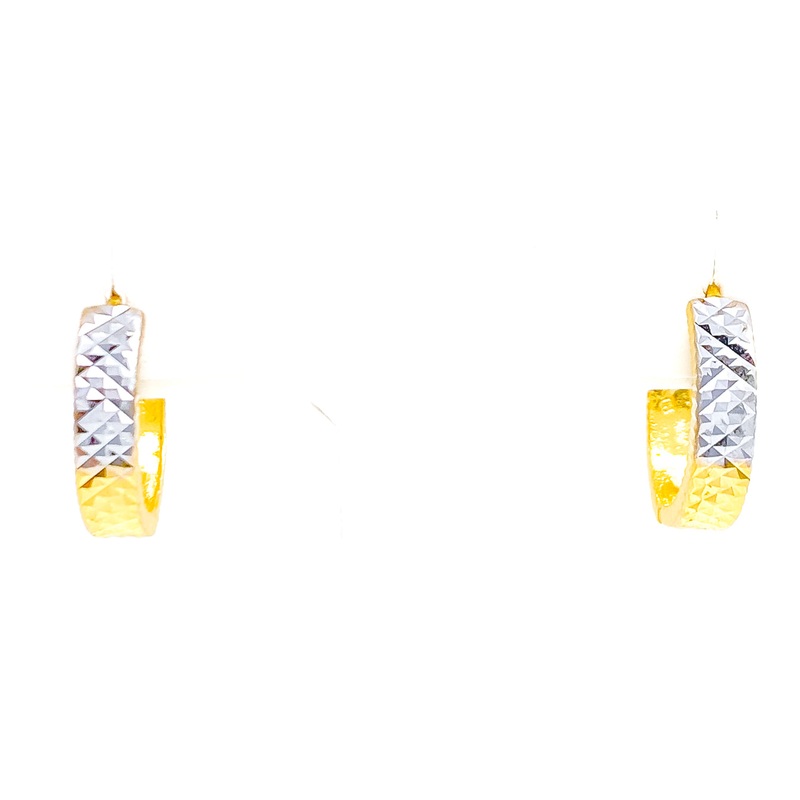 These 22k gold Bali earrings, weighing 3.1 grams, feature a luscious and shimmering design with a combination of yellow and white gold finishes. The dual-tone enhances their luxurious and radiant appearance. With an earring diameter of 0.7 inches, these Bali/hoop earrings are perfect for adding a touch of elegance to any outfit. Ideal for those who appreciate refined beauty and exquisite craftsmanship, these stunning earrings are a standout addition to any jewelry collection.