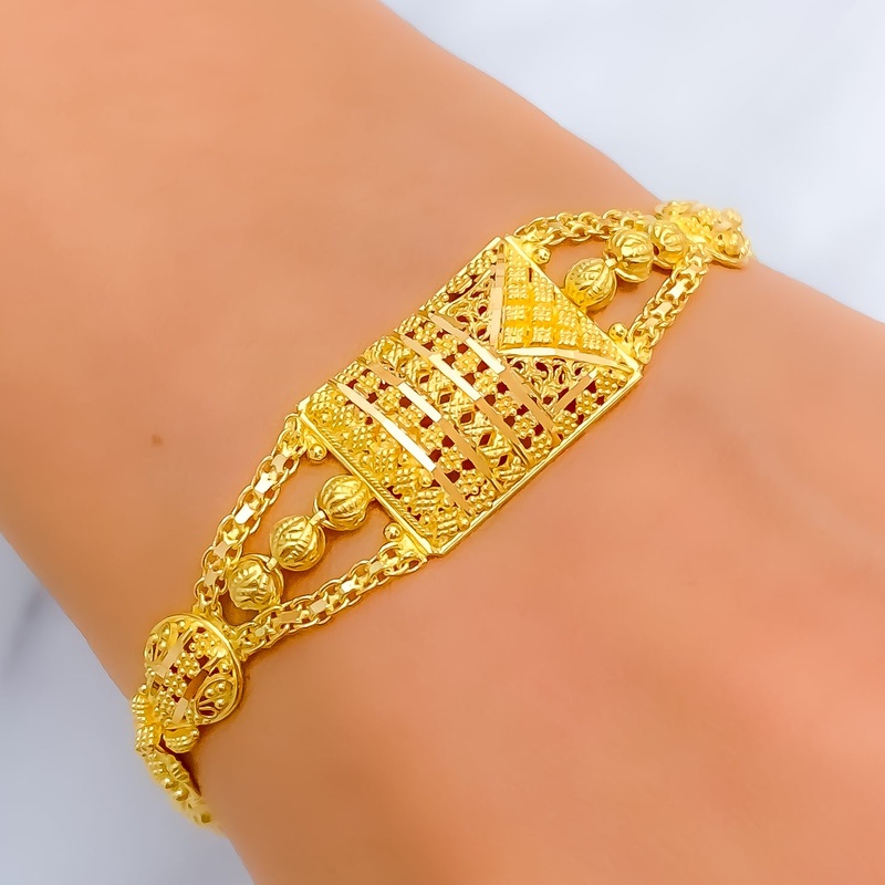 A radiant fusion of refinement and charm, this 22K gold bracelet showcases a luminous yellow gold finish. Weighing 8.6 grams, its design embodies both grace and durability. With an 8-inch length and 0.75-inch adjustable links, it provides a secure yet flex