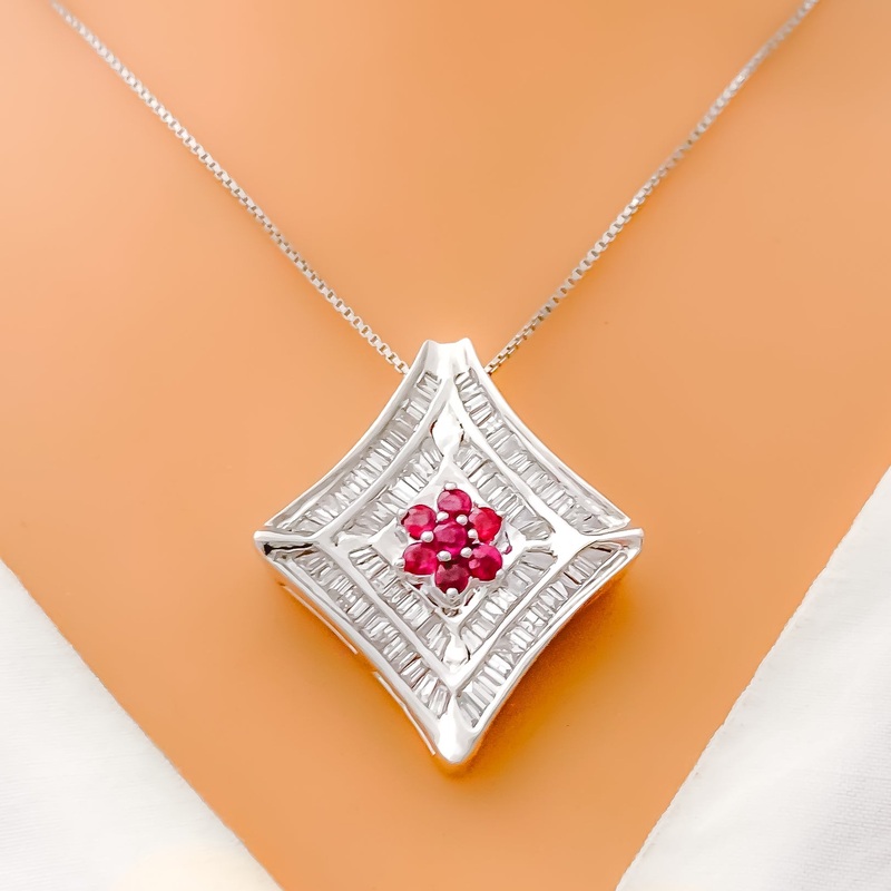 This 18k white gold necklace, weighing 8.4 grams, features a lush flower design adorned with 1.19 carats of baguette diamonds. The diamonds, with an F-G color and VS clarity, add exceptional brilliance and elegance. The necklace also includes a 0.20 carat round brilliant cut ruby, enhancing its luxurious appeal. Measuring 18 inches in length with a 1.2-inch drop, the necklace is secured with an S lock. Ideal for those who appreciate luxurious and sophisticated jewelry, this piece adds a touch of floral charm and opulence to any collection. Its exquisite craftsmanship and stunning design make it a standout piece, perfect for enhancing your personal style