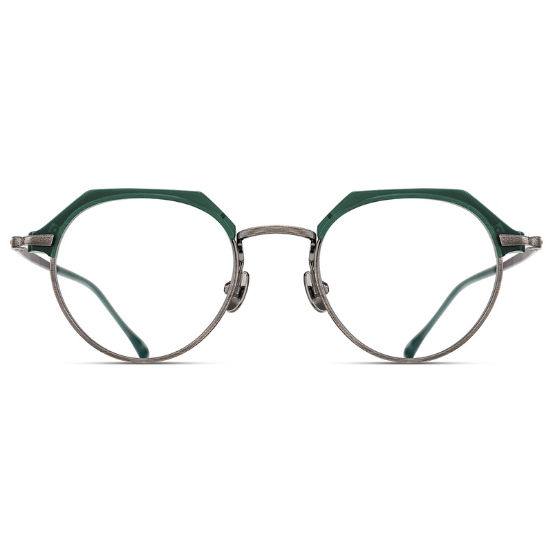 The Matsuda Eyewear // M2064 is a sophisticated crown pantos frame crafted from lightweight titanium, offering a sleek yet durable design. Its temples are adorned with intricate filigree and paired with Japanese acetate for added elegance and comfort. Hand