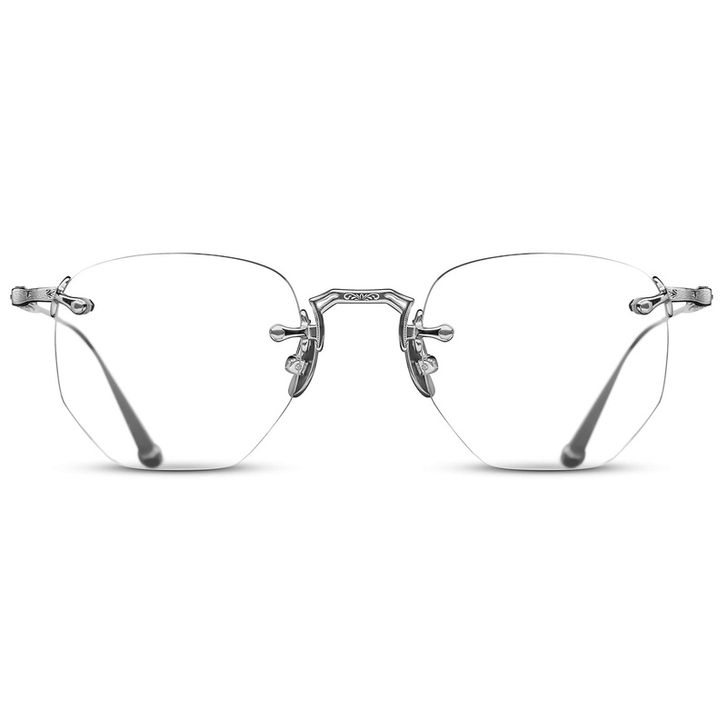 The Matsuda Eyewear // The M3104-A is a classic hexagonal drill mount style crafted of ultra lightweight titanium. Rimless designs originated in the late 1800’s as an innovation to make eyewear lighter and more comfortable. Our modern interpretation stands out with hand engraved details adorning the top and bottom of the beta titanium temples, complementing the classic construction. Includes Matsuda box, case, and cleaning cloth.