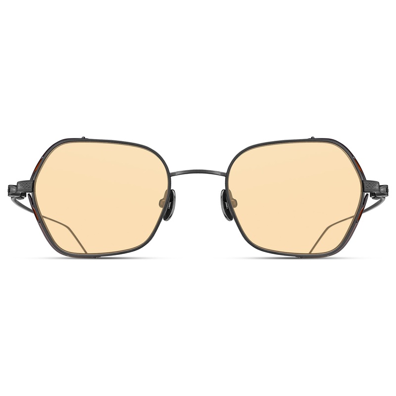 The Matsuda Eyewear // M3153 is crafted for those who exude confidence and modern sophistication. Featuring a bold geometric lens shape, this all-titanium frame is finished in precious metals for a luxurious yet lightweight feel. Sleek titanium temples pair seamlessly with gradient and caf-colored lenses, creating a distinctive look for todays trendsetters. Handmade in Japan. Includes Matsuda box, case, and cleaning cloth.